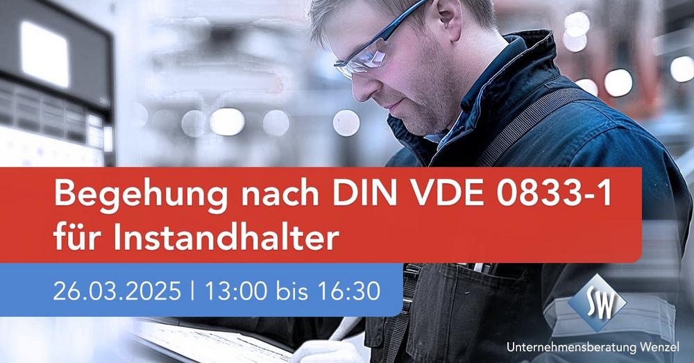 Stärken Sie Ihre Kompetenz mit unserer spezialisierten Halbtagesschulung zur Begehung nach DIN VDE 0833-1 für Instandhalter. Erfahren Sie, was bei einer Begehung zu tun ist und welche Anforderungen die DIN VDE 0833-1 stellt. Durch unser Fachwissen lernen Sie die Instandhaltungsprozesse kennen und tragen maßgeblich zum Schutz von Personen und Gebäuden bei.